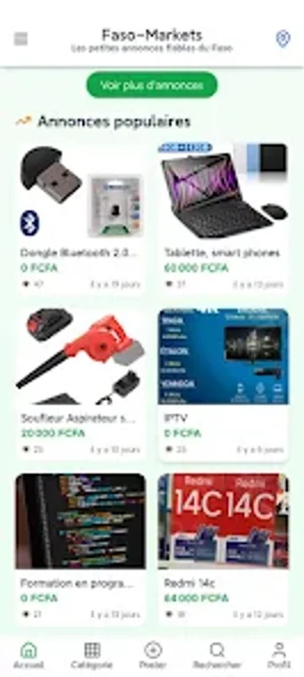 Faso-Markets is een gebruiksvriendelijke mobiele applicatie die is ontworpen voor de koop, verkoop en ruil van producten en diensten in Burkina Faso. Deze gratis app stelt gebruikers in staat om eenvoudig advertenties te plaatsen, waarbij ze foto's, beschrijvingen en prijzen kunnen toevoegen. Dankzij de geolocatiefunctie kunnen gebruikers aanbiedingen dichtbij hun locatie vinden, wat tijd en reiskosten bespaart. De app biedt diverse categorieën zoals voertuigen, vastgoed, elektronica, mode, en meer, waardoor het een veelzijdig platform is voor iedereen die in de lokale markt wil handelen.